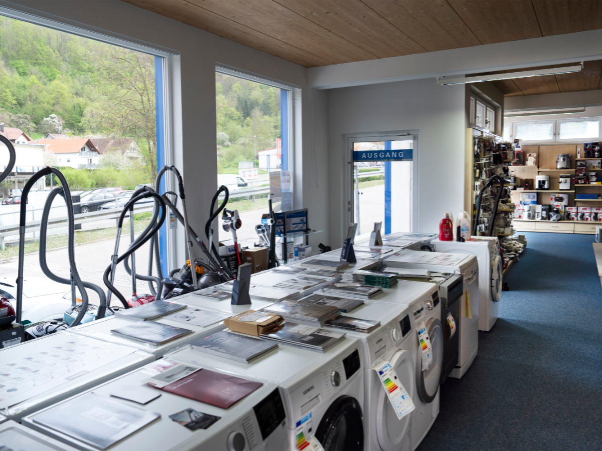 Daher wurde es dort auch bald zu eng, sodass wir bis 2014 zweimal mit unserem Geschäft umzogen. Aktuelles Domizil ist ein Neubau an der Drackensteiner Straße 120 am Ortseingang von Gosbach. Dort präsentieren wir Ihnen auf 200 qm ausgewählte Geräte beispielsweise der Marken Metz, Panasonic, Samsung, Miele, Bosch und Siemens. Hier werden Sie von uns fachkundig beraten, können Geräte anfassen oder ausprobieren und bekommen neben Original-Zubehör und -Ersatzteilen auch wertvolle Tipps zu Pflege, Bedienung und Energieeffizienz. Über unseren elektronischen Katalog haben wir überdies Zugriff auf mehr als 10.000 Geräte, sodass wir Ihnen Ihr Wunschprodukt innerhalb von 24 Stunden liefern können.